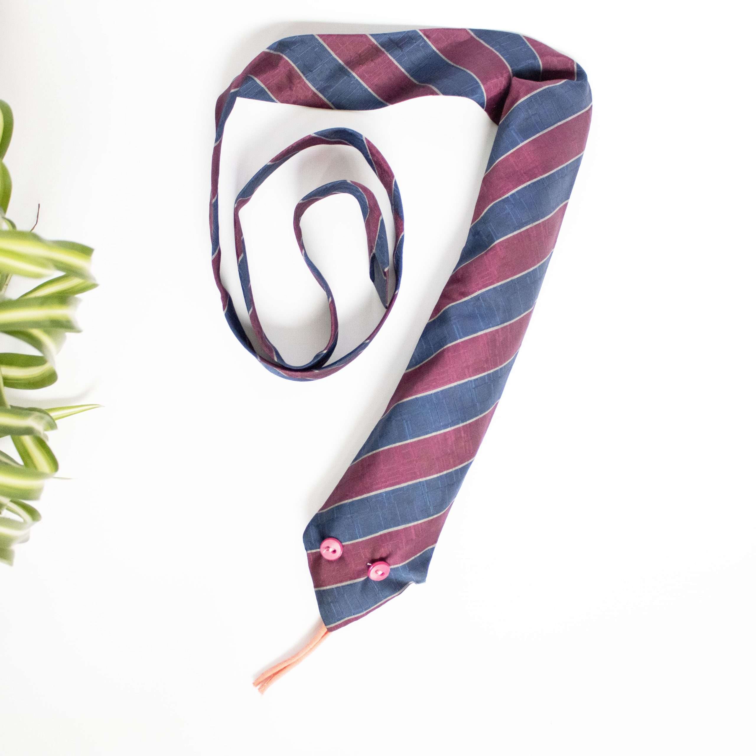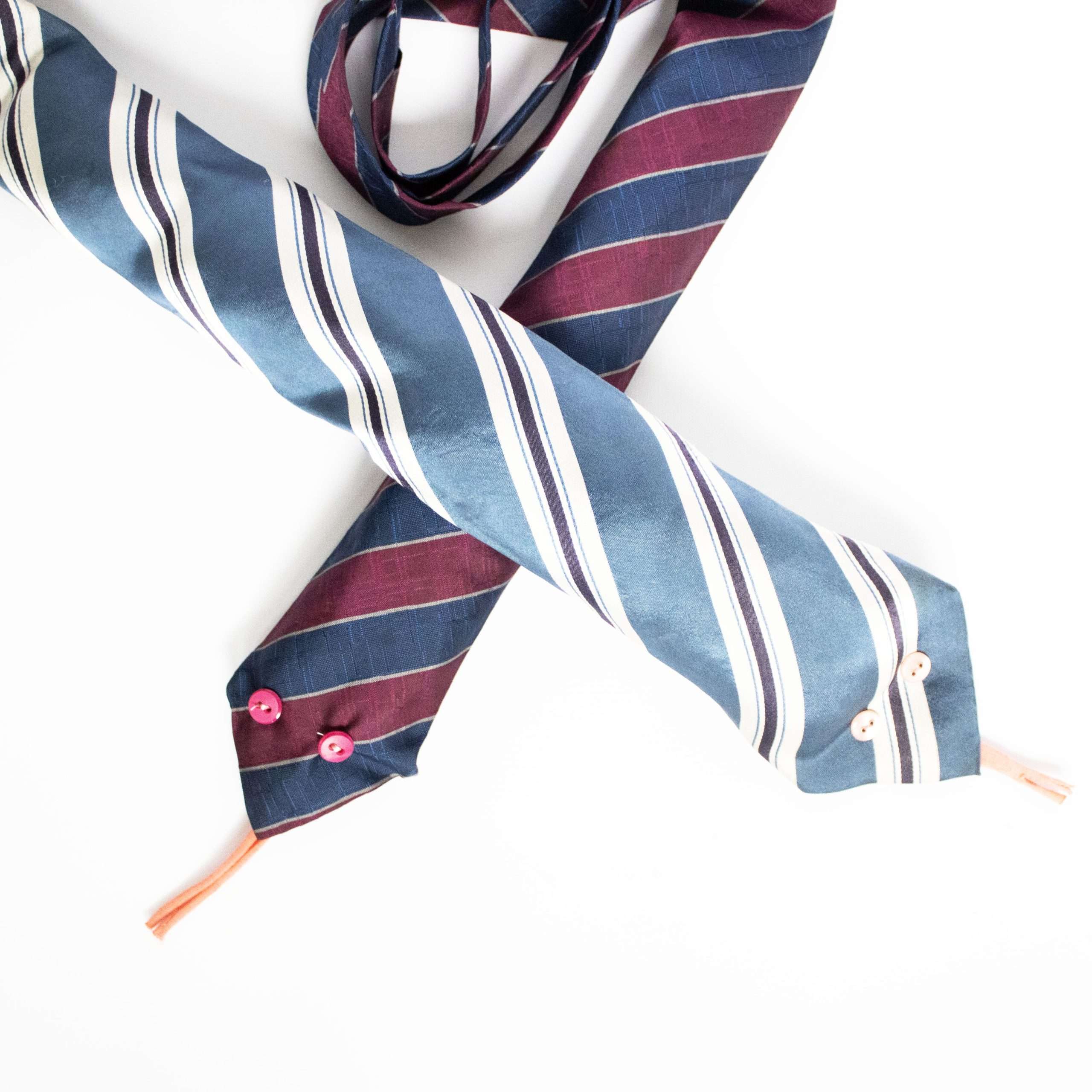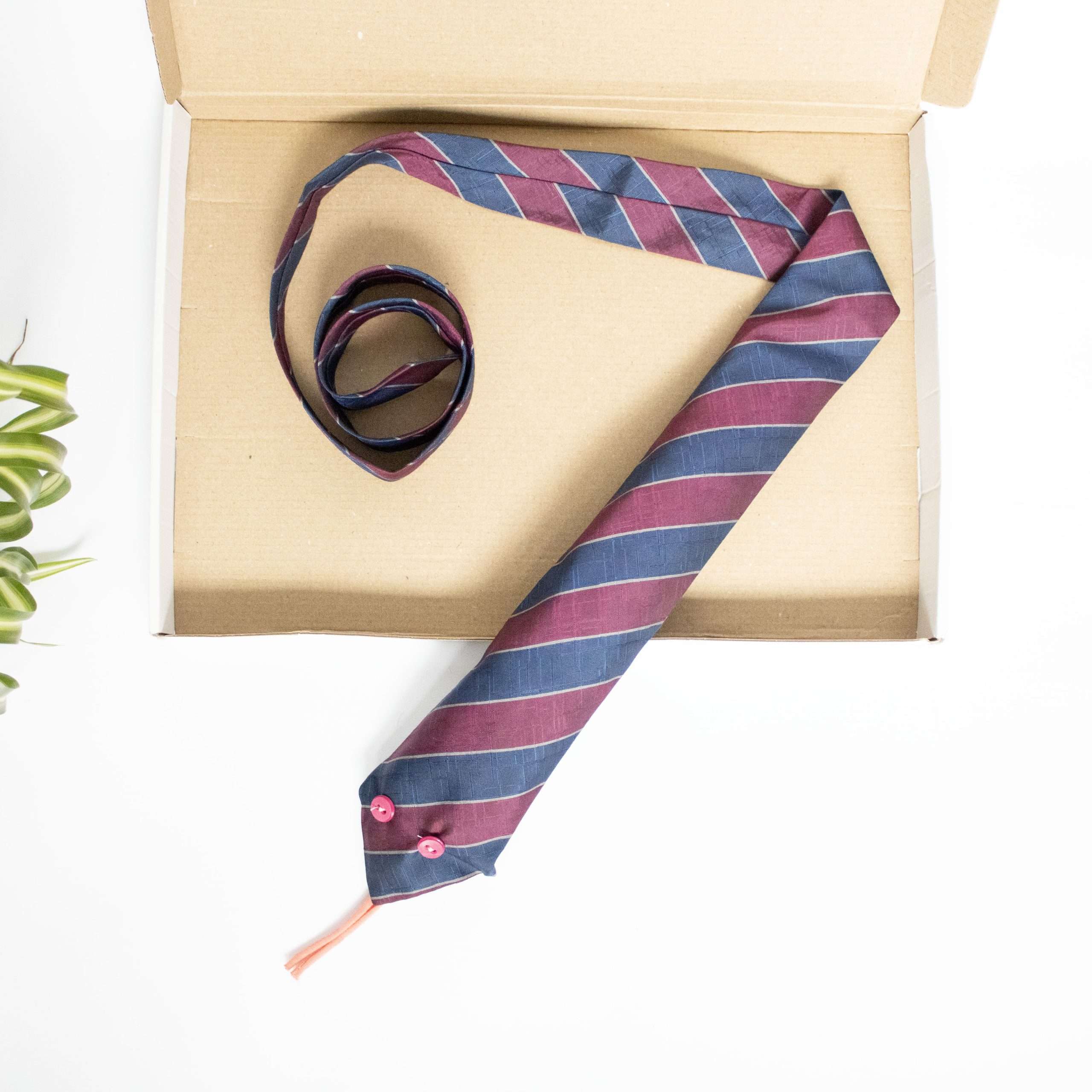 1. Oude Stropdas: We geloven in het hergebruiken van materialen. Elk pakket bevat één zorgvuldig geselecteerde, oude stropdas, klaar om te transformeren.