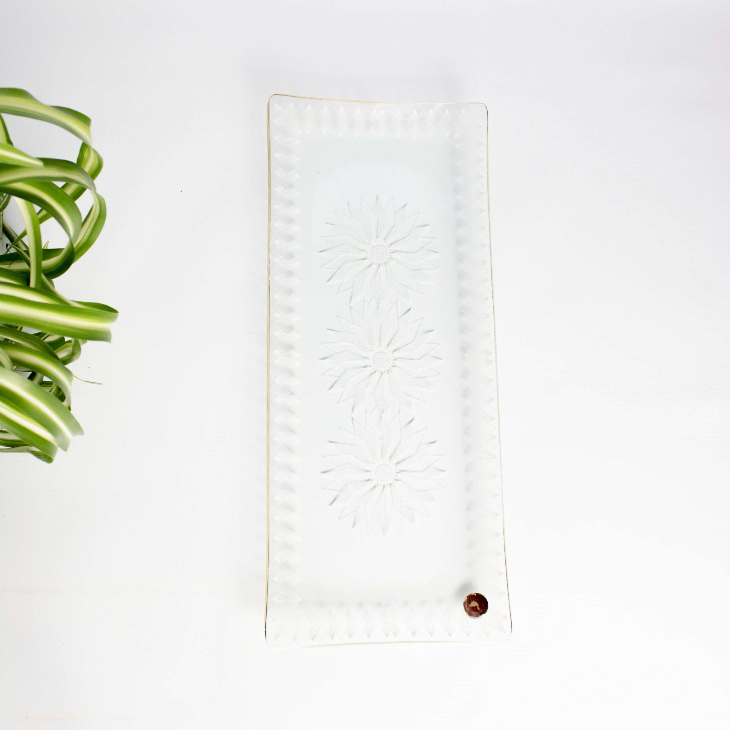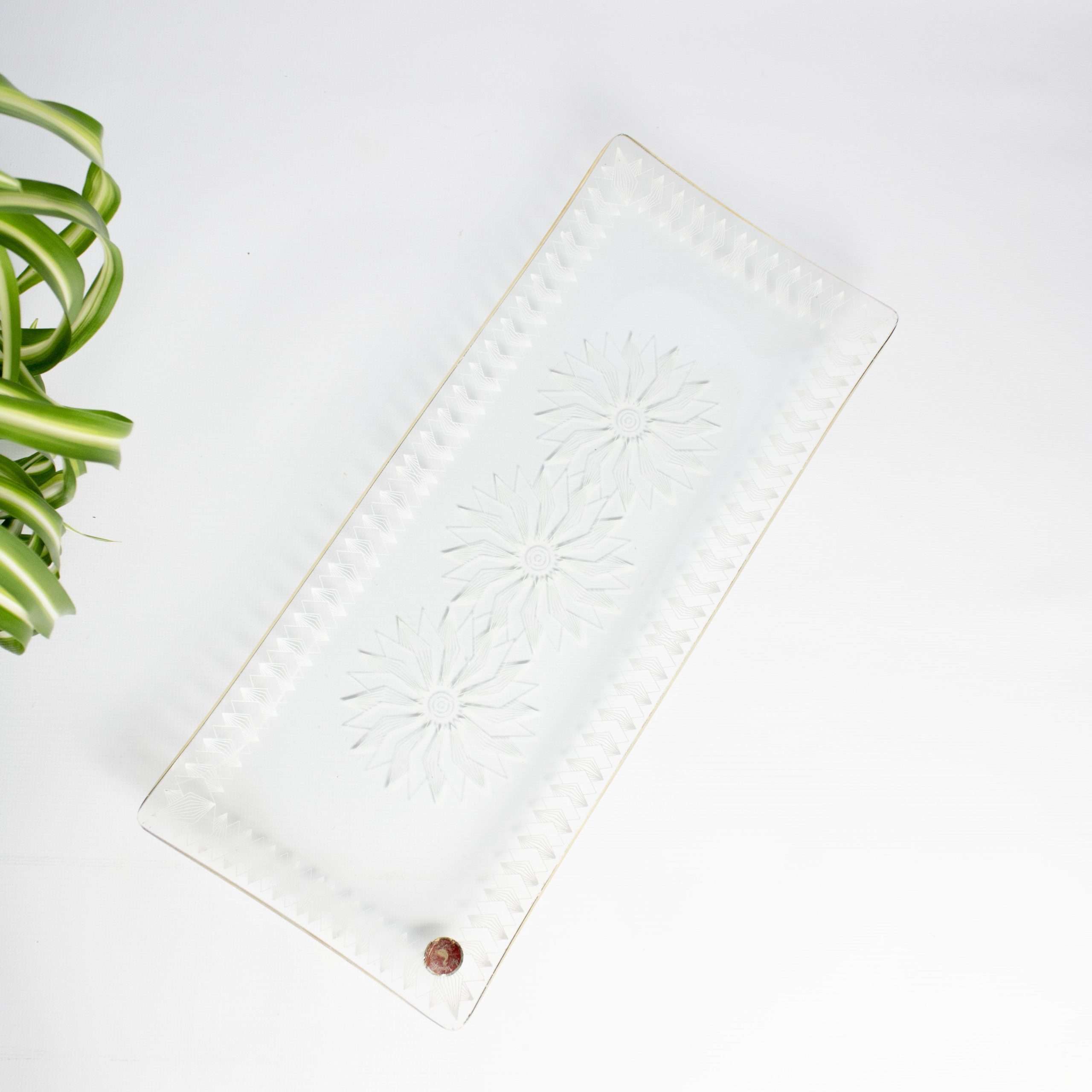 Deze vintage cakeschaal is van glas. Er zit een witte grafische print op. Langs de randen zitten ‘wieber’ figuren en in het midden zit een bloemenpatroon. Rondom zit een goudkleurige rand. Deze cakeschaal is van het merk The White Goose en is gemaakt in Nederland. Serveer jij je cake op deze mooie vintage cakeschaal glas grafisch?