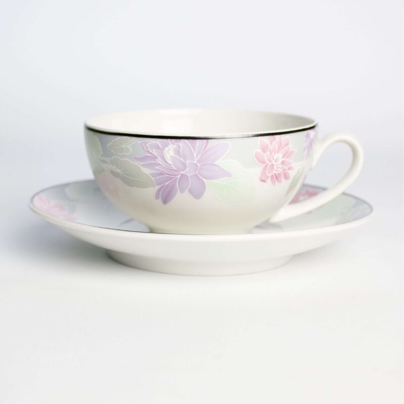 Deze leuke set van twee vintage koppen en schotels heeft een mooie bloemenprint. Het zijn waterlelies in roze en paarse tinten. Langs de randen van de van de print zit aan de bovenzijde nog een zwarte lijn. Deze set is van het merk Kronester Bavaria. Theedrinken wordt extra leuk uit deze vintage kop en schotel bloemen.