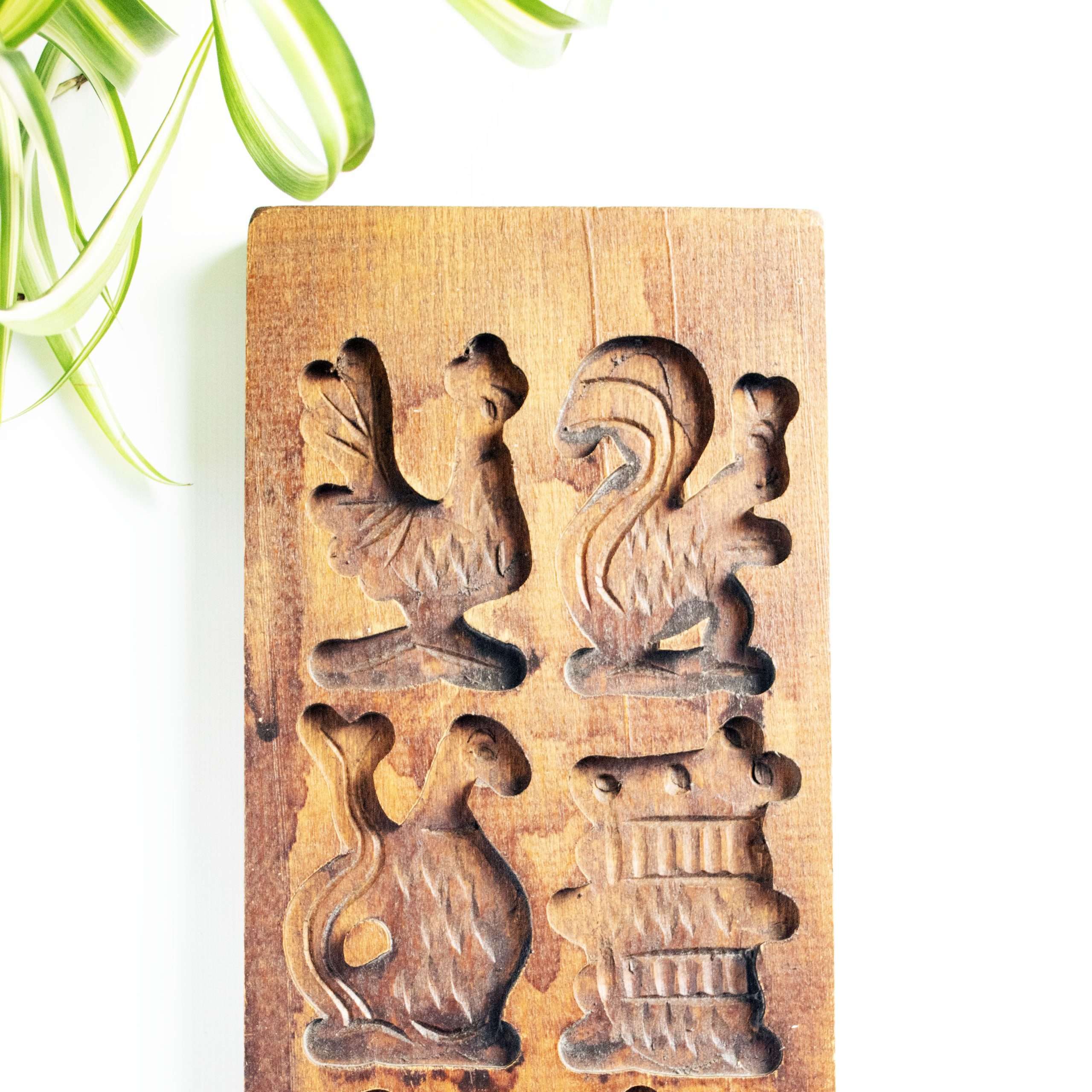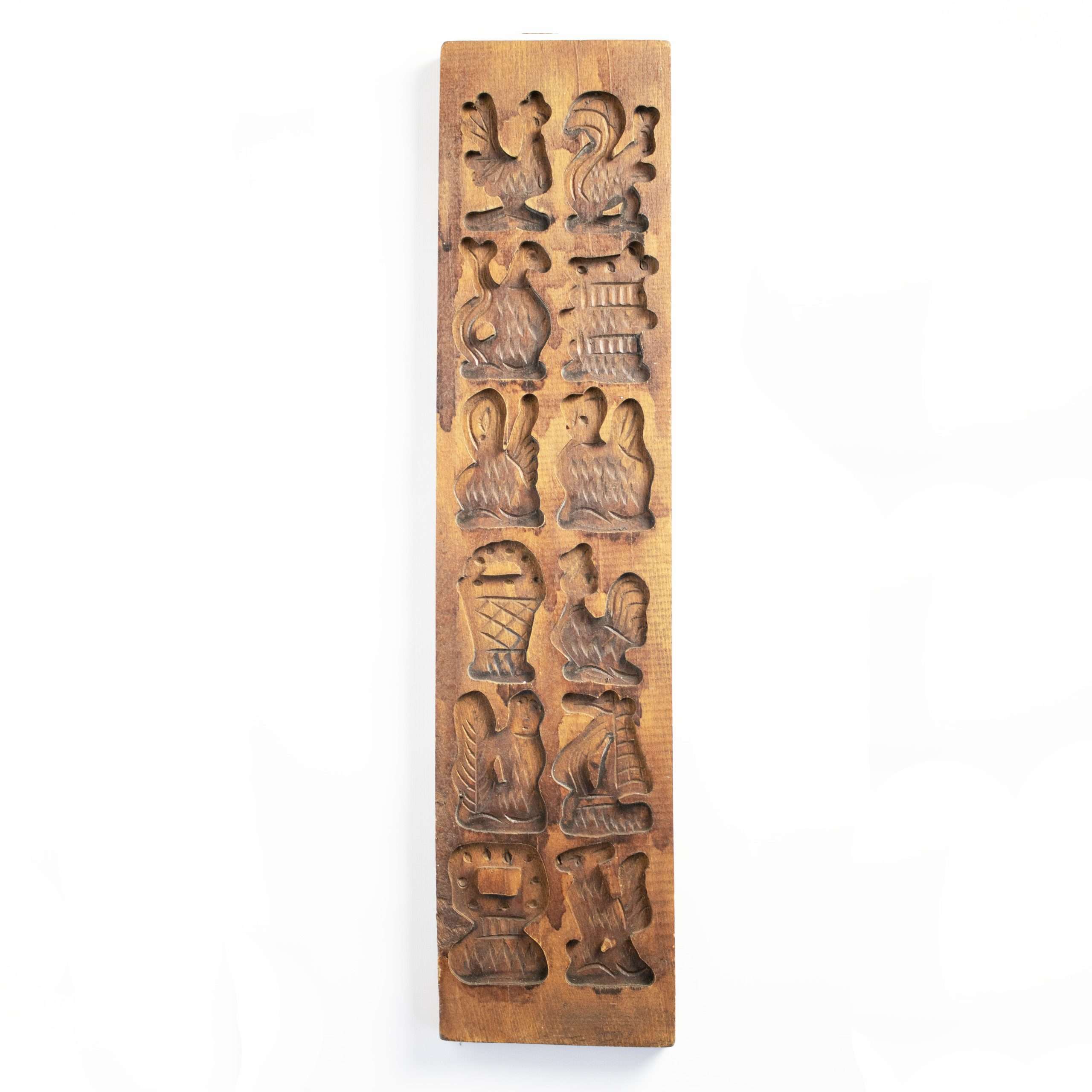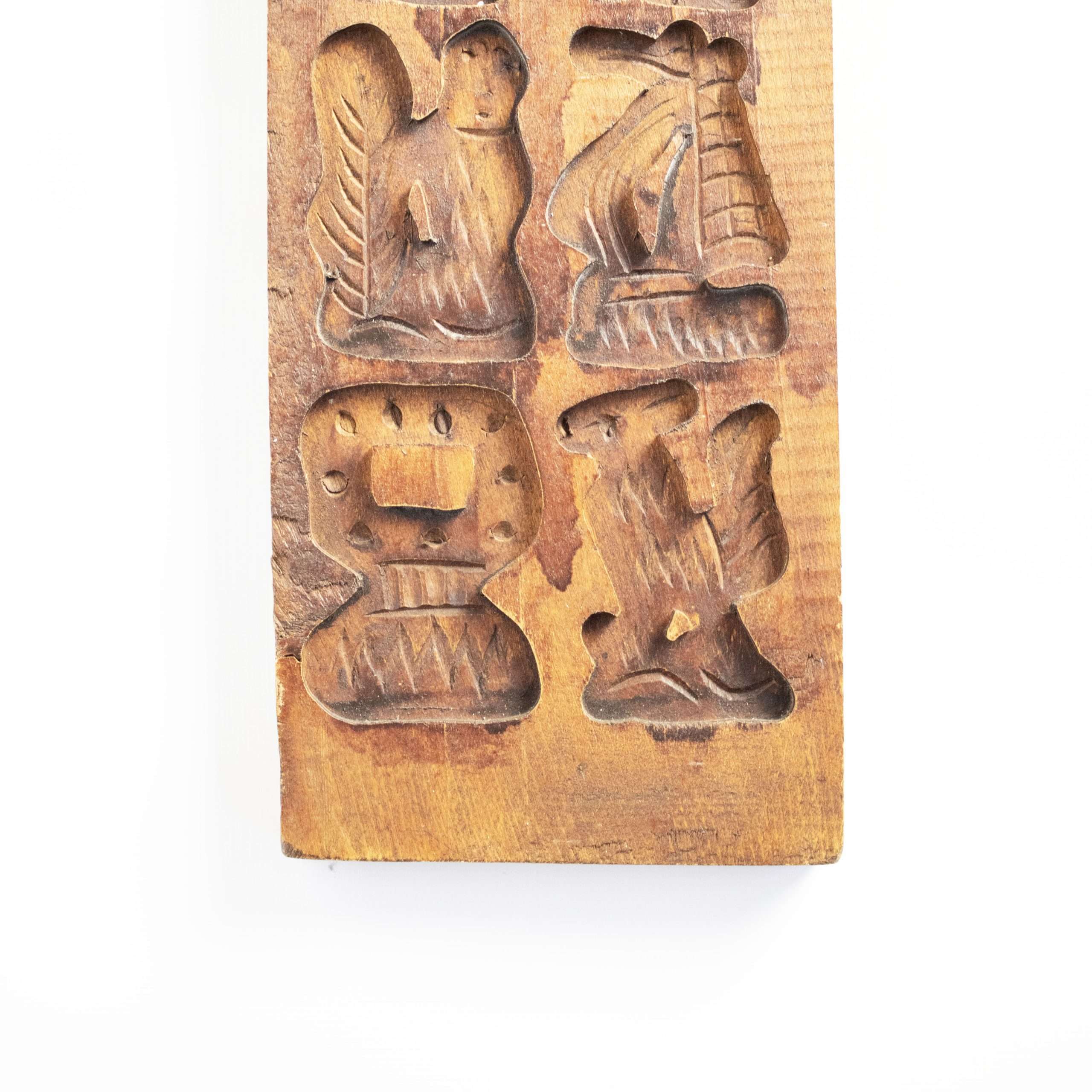 Deze prachtige vintage speculaasplank van hout werd vroeger gebruikt om speculaasjes mee te maken. Tegenwoordig gaat dat allemaal machinaal. De plank werd ingestrooid met bloem en het deeg werd daarna in de vorm gedaan. Met een mesje werd het overtollige deeg weggehaald en vervolgens werden de speculaasjes uit de vorm gehaald om te kunnen bakken. Je kunt met deze vorm natuurlijk nog steeds speculaas maken of je kunt ‘m aan de muur hangen. Op deze vintage speculaasplank hout zit achterop een gaatje.